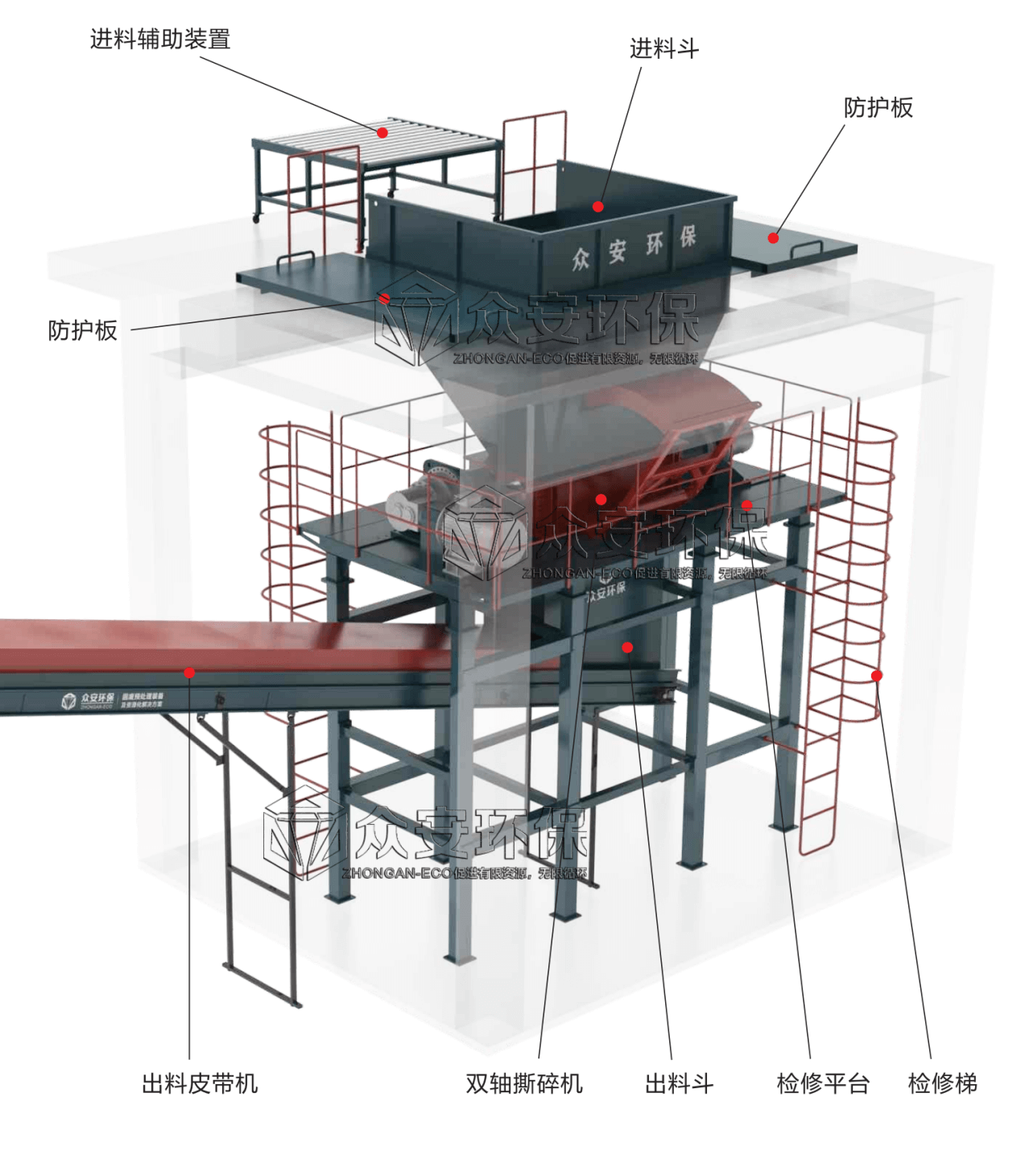 眾安環保大件垃圾處置系統全程密封結構,可以配合負壓除塵設計,能夠抑制大件垃圾破碎時粉塵外溢,實現清潔生產。